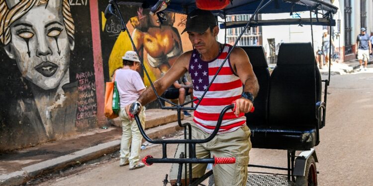 A man wearing a US-flag designed T-shirt rides his tricycle along a street in Havana / ©AFP