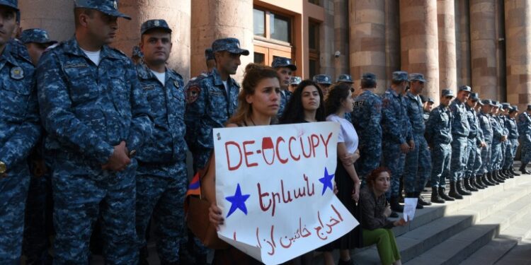 Protesters rallied in Yerevan on Tuesday outside the Russian embassy in anger that Russia did not prevent the offensive by Azerbaijan.