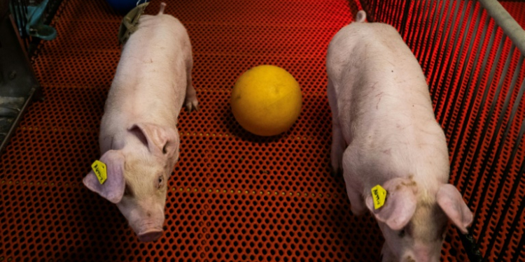 Young genetically altered pigs walk past a ball in their pens at the Revivicor research farm in Blacksburg, Virginia on November 20, 2024. ©AFP