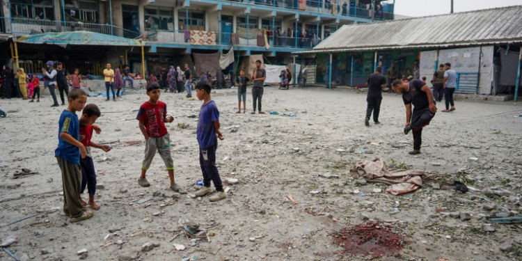 Palestinian boys stand near blood stains at a UN school housing displaced people that was hit during Israeli bombardment in Nuseirat in the central Gaza Strip. ©AFP