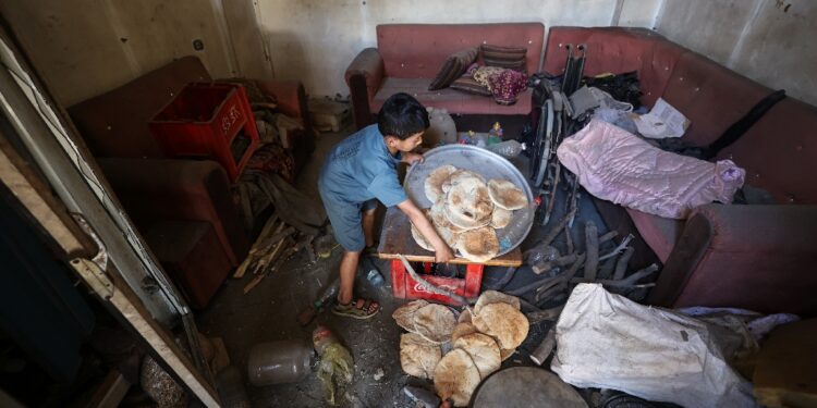 A Palestinian boy salvages bread from a makeshift bakery hit by Israeli strikes at the Nuseirat refugee camp in central Gaza / ©AFP