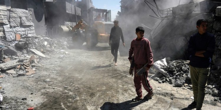 Palestinians clear a road of rubble after a night of Israeli bombing at Nuseirat refugee camp in the central Gaza Strip on Wednesday. ©AFP