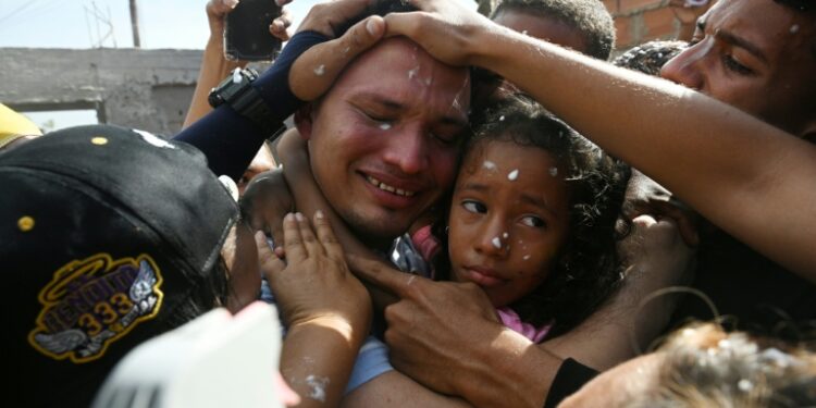 Mervin Yamarte (C), a Venezuelan migrant repatriated from a prison in El Salvador, is welcomed by his family upon arrival at his home in Maracaibo, Venezuela. ©AFP