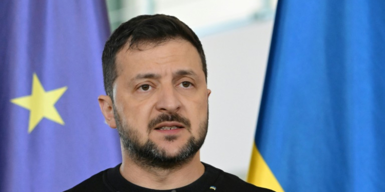 Ukrainian President Volodymyr Zelensky gives a joint press conference with the German Chancellor . ©AFP