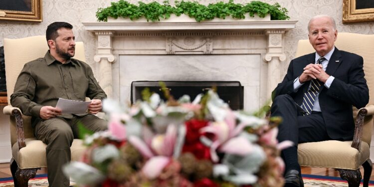 Wearing his trademark olive green military-style shirt, Zelensky said Ukraine “has exactly what our soldiers need” after Biden announced a new package of US military aid, including sophisticated air defense weapons.